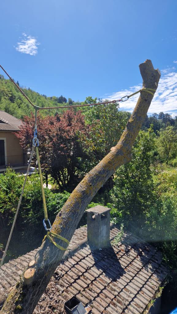 Laddove non è possibile operare con mezzi meccanici, interveniamo mediante tecniche di arrampicata su fune (tree climbing). Questo ci permette di muoverci all’interno della chioma e smontare l’albero “pezzo dopo pezzo”, calando ogni ramo a terra in modo guidato e controllato, evitando danni a tetti, recinzioni o giardini sottostanti.
